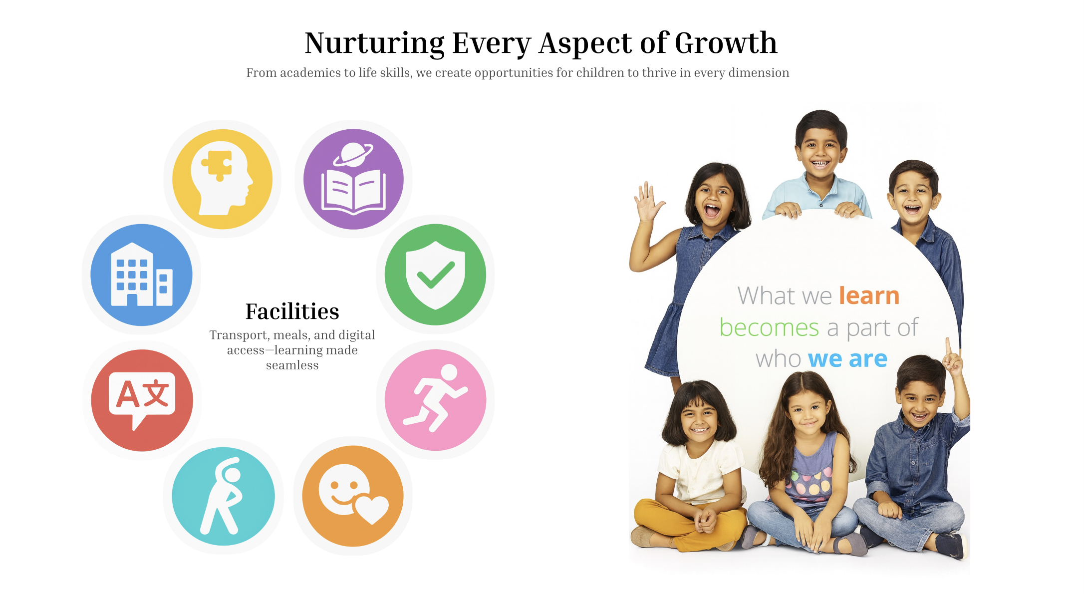 A campus designed for growth—with world-class sports arenas, child-safe elevators, smart classrooms, and creative play zones.